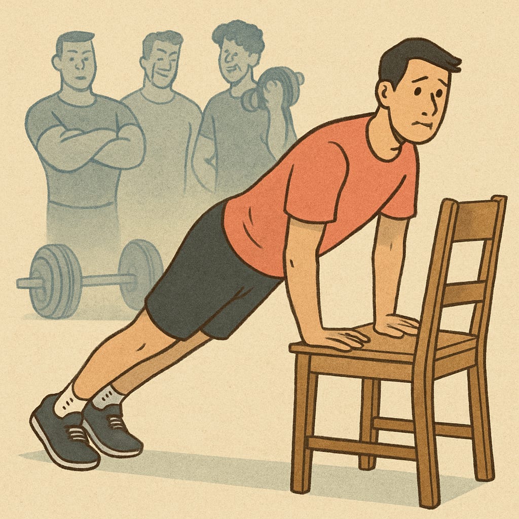 Nee. Juist door nú te beginnen, bijvoorbeeld met een stevige stoel in je woonkamer, leg je een veilige, schaalbare basis voor echte vooruitgang. Zonder sportschool, zonder ervaring, gewoon met je eigen lichaamsgewicht.